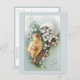 Cartão de Páscoa de safra fino com pintinho amarelo-doce com ovo de Páscoa, lírio-do-vale, salgueiros de rata e "Saudações de Páscoa" em roteiro de prata.