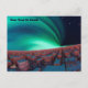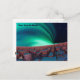 Uma aurora, verde devido ao oxigênio ionizado, aparece baixa no horizonte, uma cidade está no primeiro plano. Adicione seu próprio texto.