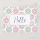Um cartão postal com um padrão deliciosamente divertido. Ilustração de donuts rosa e verde pastel com confeitos e glacê.