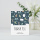 Obrigado postal com um padrão festivo caprichoso. Ursos polares, renas, árvores, raposas e flocos de neve. Num fundo verde escuro.