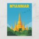 Um vibrante pôster de viagem em estilo retrô mostrando as icônicas pagodes douradas de Myanmar. A ilustração apresenta estupas deslumbrantes brilhando sob um céu azul claro, erguendo-se acima de uma paisagem exuberante de selva verde. Palmeiras e pássaros em voo adicionam à atmosfera serena e tropical. Este design retrô é perfeito para aqueles que amam viagens, cultura do Sudeste Asiático e arquitetura única. Ele evoca uma sensação de tranquilidade espiritual e aventura, tornando-se uma bela peça de arte para qualquer casa ou escritório.