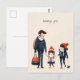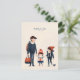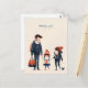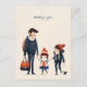 Este cartão mostra uma ilustração fofa de duas estudantes caminhando com o pai para a escola. Este é um cartão postal de excelente para as comemorações da escola. Você pode personalizar o texto.