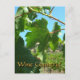 Vinha de uva - fechar folhas verdes à luz do sol. Colina castanha e filas de videiras no fundo. "Vinho País!" em letras douradas com sombra.