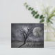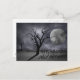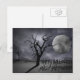 Uma ilustração assustadora do Dia das Bruxas: paisagem assustadora à noite com a lua de cheio, nuvens e uma silhueta escura de árvores com uma aranha enforcada.