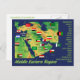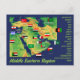 Cartão postal com um mapa da região do Oriente Médio com a bandeira correspondente. Os países listados são Afeganistão, Bahrein, Egito, Irã, Iraque, Israel, Jordânia, Kuwait, Líbano, Omã, Paquistão, Qatar, Arábia Saudita, Sudão, Síria, Turquia, Turcomenistão, Emirados Árabes Unidos e Iêmen