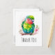 Cartão de agradecimento com uma ilustração de um papagaio fofo. Um pequeno papagaio verde com cores azul e amarelo se misturando. O pescoço tem uma tonalidade vibrante de rosa avermelhado.