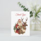 Cartão postal de agradecimento com uma ilustração divertida de Natal. Papai Noel no seu traje vermelho tradicional montado num grande renas com chifres decorado com azevinho. Uma árvore de Natal ao fundo.