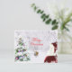Papai Noel está olhando para uma rena e árvore de Natal em uma paisagem de neve. Papais noeis únicos e renas em uma cena de Natal.