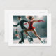Um par de skatistas de gelo é capturado em uma pose dinâmica durante uma apresentação, com uma mulher de vestido vermelho e um homem de terno a glorificar o gelo. Seus movimentos sugerem uma rotina altamente coreografada, enfatizada pela rápida virada do cabelo da mulher e pelas expressões focadas em seus rostos; outro skater pode ser visto ao fundo.