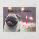 Um cachorrinho de cor bonito e engraçado tem um sorriso de língua feliz no rosto dele e um bolo de aniversário no fundo adorável cachorro ama cartão postal de aniversário