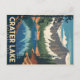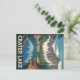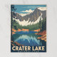 Um poster de viagens ao estilo de vintage para o Parque Nacional do Crater Lake mostra o lago azul profundo refletindo montanhas com capas de neve e florestas de pinheiros sob um céu azul claro. O "CRATER LAKE NATIONAL PARK" aparece com ousadia na parte inferior.