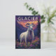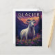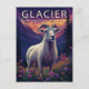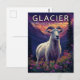Descubra a beleza do Parque Nacional Glacier com este cartão-postal deslumbrante. Com um majestoso bode branco em primeiro plano, montanhas roxas imponentes e flores vibrantes de primavera, este cartão-postal de ilustração plana é perfeito para qualquer amante da natureza.