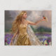 Um cartão de fantasia com uma maravilhosa fada em uma fantasia de ouro que está segurando um papagaio colorido na mão.