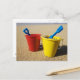 Dois grupos de pá e de baldes brilhantemente coloridos em um Sandy Beach.