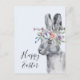 Coelhinho de cinza bonito com ilustração da coroa floral e texto de Felz pascoa personalizável sobre fundo azul pastel
