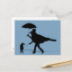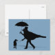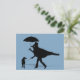 Uma silhueta de um pássaro vestindo um chapéu de cima. A ave tem pernas e braços. Está segurando um guarda-chuva e uma coleira acoplada a um cachorro.