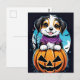 Infusamos o Halloween com um encanto adorável usando este cartão postal encantador! Um cãozinho fofo permeia uma abóbora esculpida, incorporando o espírito da piedade lúdica. Uma lua grande brilha para trás, lançando um brilho suave nesta cena encantadora. Compartilhe a alegria do Dia das Bruxas com este cartaz carinhoso.