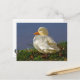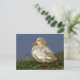 Um pequeno pato branco giro está sentado na orla costeira, pronto para dormir.