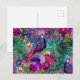 Este design ousado apresenta um pavão roxo com uma coroa dourada cercado por flores rosa e roxas em um fundo de roxo, azul turquesa e azul com elementos florais dourados.
