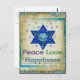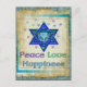 Corações, Estrela de David, e as palavras "Paz Ame Felicidade" são uma maneira adorável de dizer Feliz Chanucá.