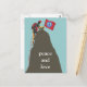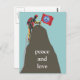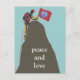 Desejos de paz e amor. Alpinista com bandeira de símbolo de paz no topo de uma montanha