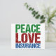 Um cartão postal de agente de seguros bonitinho, com letras verdes, vermelhas e azuis que leem Peace Love Insurance. presente de excelente para seus colegas de seguros.