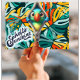 Olhar através de um zíper é um tucano vibrante, seu bico colorido e olhos brilhantes adicionando um toque dos trópicos. O pano de fundo de folhas coloridas exóticas completa o tema tropical e complementa as cores vibrantes do tucano. A tipografia divertida "Hello Sunshine" acrescenta um toque amigável e reforça a vibração positiva da design.