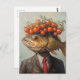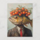 Um homem com um peixe por cabeça tem colheita de tomate fresco do jardim em arte de fantasia surreal de cabelos