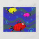 Peixes de desenho animado funk nadando contra fundo azul de onda e bolhas de retro