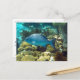 Nadando sobre os corais macios, as escamas de um peixe recife azul pegam algumas vernizes do sol, à medida que a luz se filtra acima da superfície da água, enquanto outros peixes menores natações no fundo.
