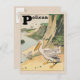 Pelicano na praia do mar com outras aves voando no ar entre os penhascos rochosos sobre o oceano. A letra alfabética P é para "Pelican", impressa no topo do cartão postal em letras negrito para ajudar crianças e estudantes de AEP a aprenderem seus ABCs.