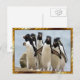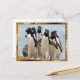 Seis pinguins caminhando pelo oceano na praia arenosa. Com uma grande rocha e um belo céu azul. Este cartão-postal tem uma estrutura de bronze e prata de ouro.