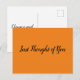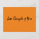 Clássico, mas simples cartão postal para aqueles tempos em que você tem um pensamento fugaz específico sobre alguém e quer "rapidamente" informá-los. Uma chamada telefônica será certamente útil, mas essa manutenção especial dura por quanto tempo o destinatário deseja. Alcance e surpreenda alguém com a sua atenção! Há muitas cores e várias mensagens para escolher.