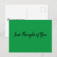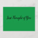 Cartão postal sofisticado, mas simples, para aquelas vezes em que você tem um pensamento passageiro específico sobre alguém e quer 'rapidamente' deixá-los saber. Uma ligação certamente resolverá, mas esse souvenir especial dura o tempo que o destinatário desejar. Entre em contato e surpreenda alguém com sua consideração! Há muitas cores e uma variedade de mensagens para escolher.