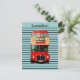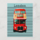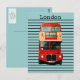 Foto de saída do brilhante ônibus de Londres vermelho do tipo Routemaster, sobre fundo de linhas pretas e verde-menta com o título "Londres".