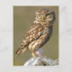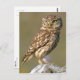 Cartão de animais mostrando uma coruja pequena. A pequena coruja (Athene noctua) é uma ave que habita muitas das partes temperadas e mais quentes da Europa, da Ásia a leste da Coreia, e do Norte de África. A coruja adulta da forma mais disseminada é marrom-esbranquiçada acima, e branco-esbranquiçado abaixo. Tem uma cabeça grande, pernas longas, olhos amarelos, e suas sobrancelhas brancas dão uma expressão forte. Esta espécie tem um voo soprador como um pica-pau.