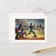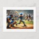Um jovem jogador de beisebol está no bastão, prestes a balançar numa bola lançada, enquanto o apanhador e o árbitro estão em posição, e os colegas de equipe e os espectadores assistem ao jogo. A luz solar acende o campo, destacando a ação e dando vida à cena.