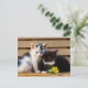 Mande este cartão de flor de gatinhos para o amante de gatos na sua vida. Apresenta uma foto de dois gatinhos bonitos com uma flor amarela em um banco de madeira rústico. Fotografia criada pela fotógrafa Maria Jeffs, prêmio vencedora.