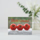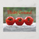 Permaneçam Saudáveis com três tomates vermelhos em uma parede branca diante da natureza verde