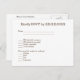 RSVP minimalista e cartão postal de menu para enviar para qualquer evento, casamento, janto de ensaio, aniversário, aniversário etc. Boa ideia para aqueles que estão no orçamento enviarem um cartão postal em vez de um cartão normal para um RSVP. Personalize esta modelo para adicionar suas informações. Clique para personalizar mais ou clique em Editar para adicionar um fundo de cor diferente, alterar o estilo e o tamanho do texto e adicionar uma foto. Ver todas as minhas COMPRAS AQUI https://bit.ly/SandyspiderStores Produtos de casamento em zazzle.com/store/anniversarywedding e zazzle.com/store/sandyspider/weddings