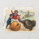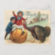 Deseje aos seus amigos e familiares com este cartão postal de Dia de Ação de Graças com imagem elegante de crianças vintage com abóbora brincando com peru. Personalize o texto de desejos para criar um souvenir inesquecível das festas.