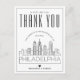 Uma forma excelente de mostrar apreço ao convidado que viajou tão longe do seu caminho para vê-lo, nesta bela cidade. Este obrigado especial que você faz é adaptado ao convidado que esteve no seu casamento na bela cidade de Filadélfia, Pensilvânia. Ele apresenta uma linha do horizonte estilizada da cidade na frente do cartão. Ao contrário, é um ponto para sua própria mensagem exclusiva. Use as funções de personalização para adicionar uma foto, se desejar.
