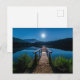 Um cartão postal com uma bela fotografia de um píer de madeira esticado sobre um lago calmo. O céu noturno coberto de estrelas e uma bela lua de cheio.
