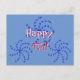 Os fogos de artifício oferecem uma saudação "Happy 4th!". Rodinhas de estrelas azuis brilhantes rodeiam o texto que aparece em vermelho e branco com sombreamento. O fundo é azul médio.