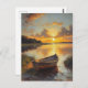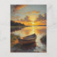 Uma pintura tranquila de um barco descansando na costa ao pôr do sol, cercado por gramíneas de pântano e tons de céu brilhantes, evocando serenidade costeira pacífica.