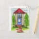 Pintura original da aguarela por Martha Goutal que caracteriza uma casa colorida com um telhado vermelho e umas árvores lunáticas de cada lado, e uma passagem pequena do tijolo.