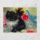 Cartão postal com um gatinho preto e branco! Esse tuxedo fofo se posou entre as flores vermelhas num cobertor azul. Um presente magnífico para amantes de gatos e entusiastas de arte vitorianos!