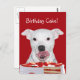 White pitbull terrier lambe suas costeletas por causa de um bolo de aniversário que ama um cachorro festejar cartão postal