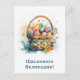 Diga Felz pascoa em ucraniano - um cartão de Felz pascoa bonito em língua ucraniana, com uma cesta de ovos coloridos.