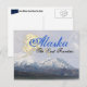 Um cartão de posto mostrando a palavra Alaska The Last Frontier sobre um antigo mapa do estado do Alaska com o Monte McKinley localizado no Parque Nacional de Denali. Excelente do Alaska souvenir.